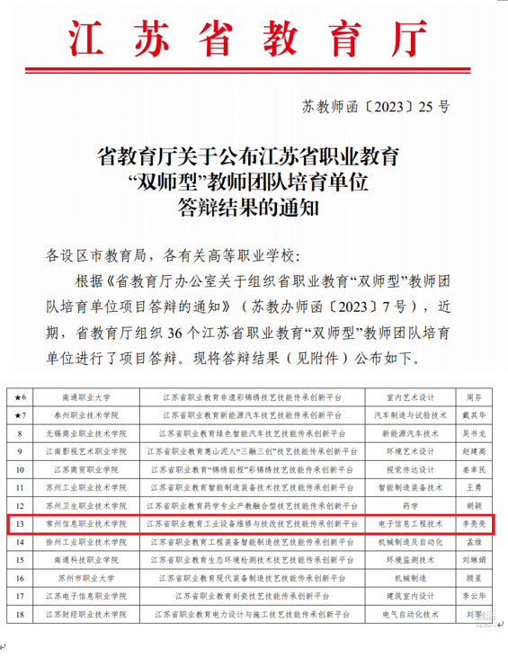 近日,江(jiāng)蘇省教育廳公布了省級職業教育“雙師型”教師團隊立項名單,常(cháng)州信息職業技術學院李亮亮(liàng)老師領銜的電子信息工程技術教師團隊申報的《工業設備維修與技改技藝技能(néng)傳承創新平台》順利通過培育單位答辯,獲(huò)得江蘇省職業教育“雙師型”教(jiāo)師團隊建(jiàn)設項目立項,並獲得省級統籌財政專項資金支持,建設周期為3年。