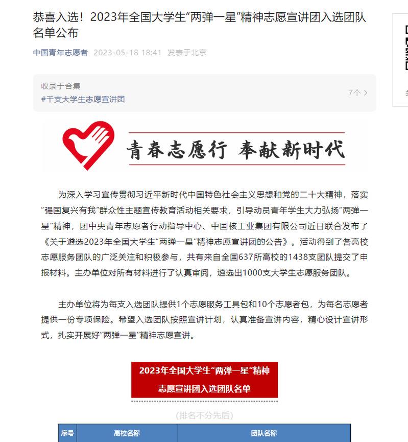 近日,由團中(zhōng)央青年誌願者行動指導中心、中(zhōng)國核工業集團有限公司(sī)聯合主辦的2023年全國大學(xué)生“兩彈一星”精神誌願宣講團(tuán)遴選活動結果公布,常州工業職業技術學院數字商務學院的“愛心驛站宣講團”成功入選。