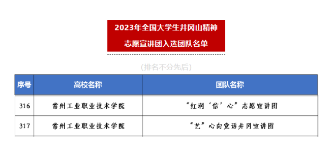 為深入學(xué)習宣傳貫徹習近平新時代中國特色社會主義思想和(hé)黨的(de)二十大精神,落實“強國複興有我”群眾性主題宣傳教育相關要求,團中央青年誌願者行(háng)動(dòng)指導中心聯合國家疾病預防控製局傳染病防控司、全國青少年井岡山革命傳統教育(yù)基地、中國青年誌願者協會(huì)分類遴選了全國大學生誌(zhì)願服務示範宣講團,常州工業職業技術學院多支宣講團入選。名單如下(xià):