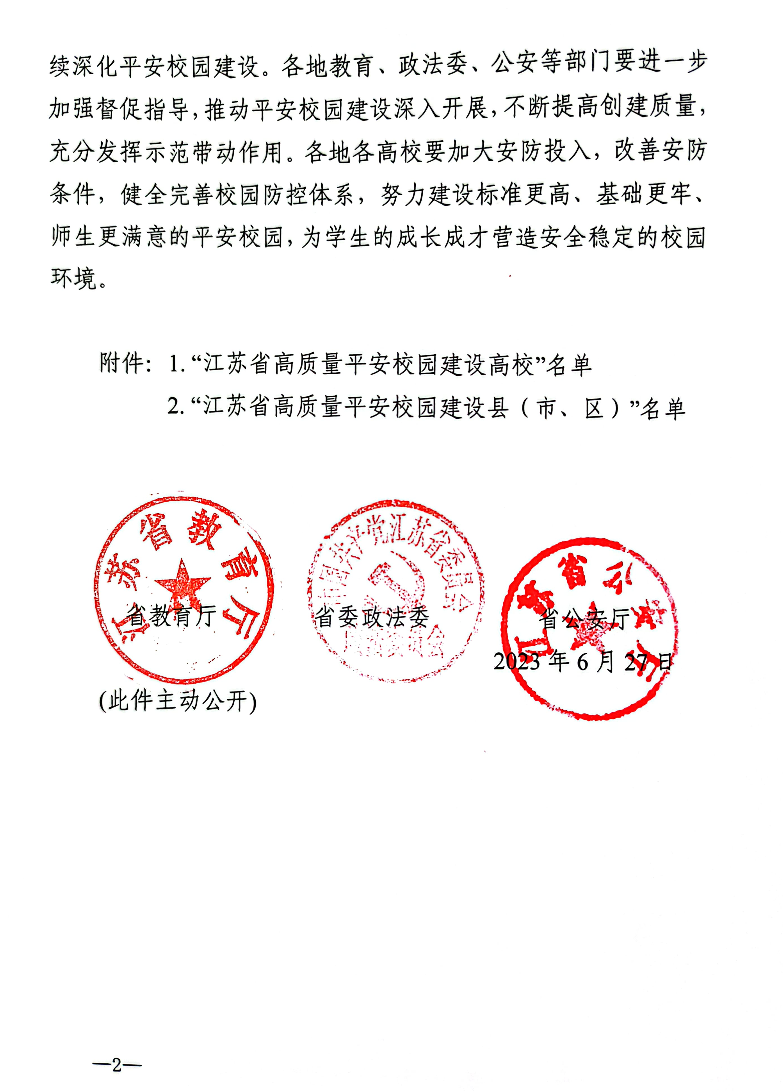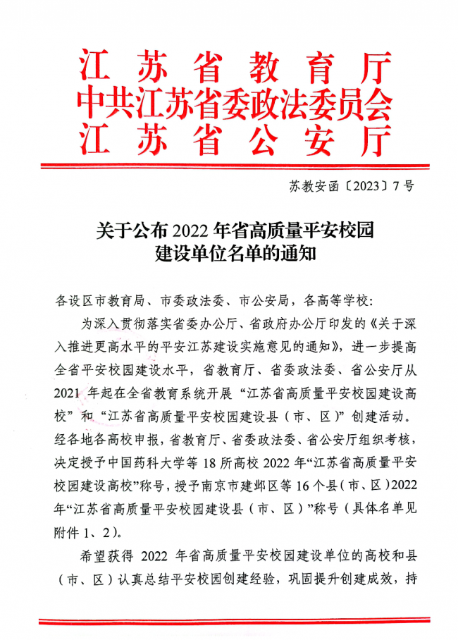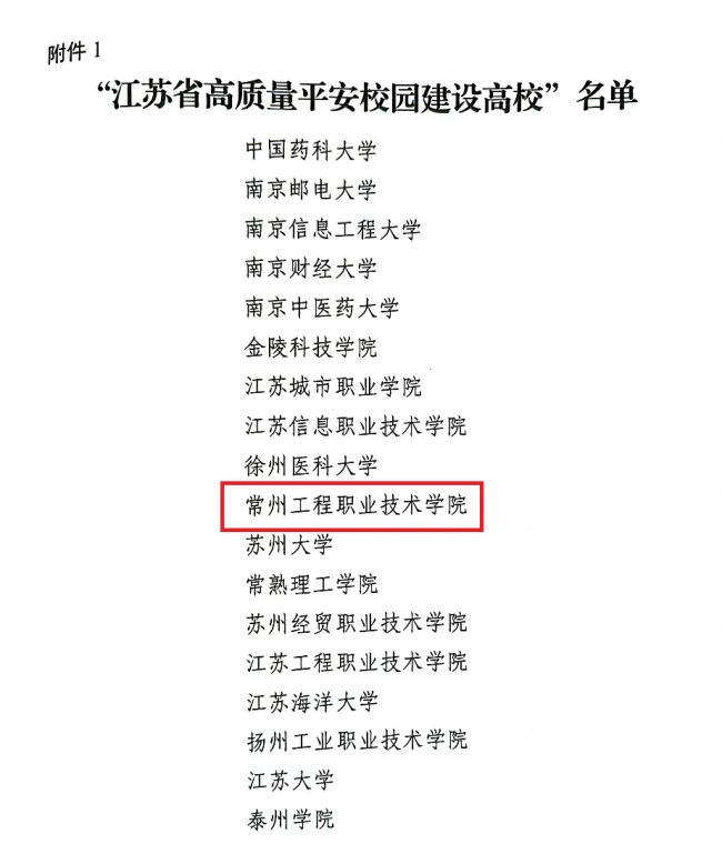 近日,省教育廳、省委政法委、省公(gōng)安廳聯合印發《關於公布2022年省高(gāo)質量(liàng)平安校園建設單(dān)位名單的通知(zhī)》(蘇教安函〔20237號),常州工程職業技術學院榮獲2022江蘇省高質量平安校園建設高校稱號。