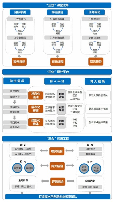 由江新,費小平,吳(wú)雲飛,駱建建,張夏雨,鄧誌輝,施豔青,仲明,徐峰,陳波,劉忠傑,劉霞,劉瀝等申報完成的(de)《高(gāo)職(zhí)院校“三雙三化三合”創新創業人才培養模式構建與實踐》項目(mù),對標《關於推動創新創業高質量發展打造“雙創”升級版的意見》《關於深化高等學校創(chuàng)新(xīn)創業教育改革的實施意見》等文件要(yào)求,堅(jiān)持問題導向、緊扣短板,回應難點問題,精準施策,科學實施“強基、培智、築巢、育苗、護(hù)航”五大工程,健全涵蓋“保障、課程、指導、實踐、活動”全(quán)要素的創新創業教育體係。項目堅持育人為本,多維發力,大(dà)力推進創新創業教育、通識教育,以“修訂人才培養方案”“健全課程體係”“深化教學改革”等紮實措施,促進學生全麵發展,增(zēng)強學生創新精神、創業意識和創新創(chuàng)業能力,努力造就大眾創業、萬眾創新的生力軍。