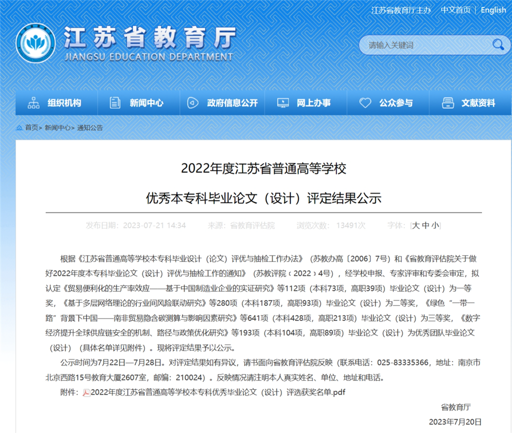 常州信息職業技術學院在2022年度江蘇(sū)省普通高等(děng)學校優秀本專科畢業論文(設計)評定中喜獲佳績