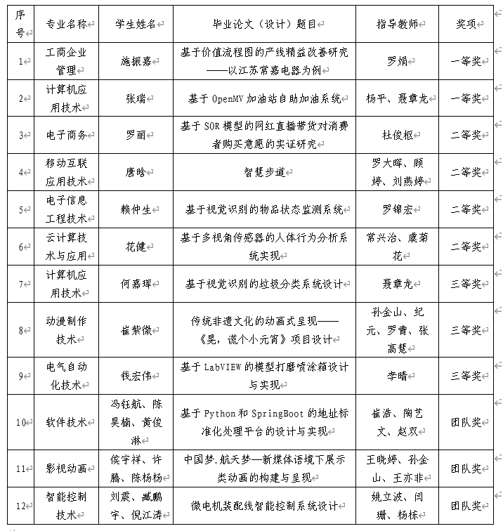 常(cháng)州信(xìn)息職業技術(shù)學院羅娟老(lǎo)師指導的《基於價值流程圖的產線(xiàn)精益改善研究—以江蘇常嘉電器為例》(學生:施振嘉)和楊平、聶章龍老師指導的(de)《基(jī)於OpenMV加油(yóu)站自助加油係統》(學生:張瑞)獲得一等獎(jiǎng),另獲得二等獎(jiǎng)4項,三等獎3項,團隊優秀畢業論文(設計)3項。一等獎數量和獲獎數量創曆年新(xīn)高。