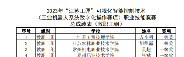 10月13日—14日,由江蘇省人力資(zī)源和社會保障廳指導(dǎo),中國機電一體化技術應用協會(huì)、南京鳳凰在線數字科(kē)技有限公司主辦,江蘇安全技(jì)術職(zhí)業學院承辦的“江蘇工匠”可(kě)視化智能(néng)控製技術(shù)“工(gōng)業機器人係統數字化操作賽項”職業技能競賽順利舉行。常州機(jī)電職業技術學院職工代表,電氣工(gōng)程學院教師吳超獲一等獎,劉澤祥(xiáng)老師指導的自(zì)動化(huà)2236班學生戴(dài)和,機器人2236班學生(shēng)梅崢嶸獲三等獎。