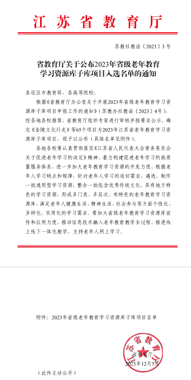 近日,江(jiāng)蘇省教育廳公布 2023年省級老年教育學習資(zī)源庫子庫項目(mù)入選名單的通知(蘇教繼函〔2023〕3號)。常州工程職業技術學(xué)院申報的“江蘇非遺:民間傳說與故事”和(hé)“涉外禮儀與修養”成功入(rù)選2023年度省級(jí)老(lǎo)年教育學習資源庫子庫項(xiàng)目。