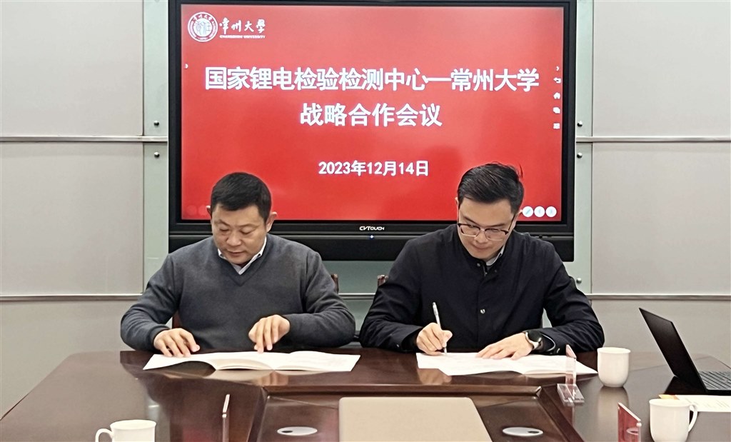 晏成林(lín)、周(zhōu)翔升分別代表常州大學與國家鋰電池產品檢驗檢測中心簽訂(dìng)了《國家鋰電池產品質量檢驗檢測中心與常州大學合作協議》。(來源:常州大學)