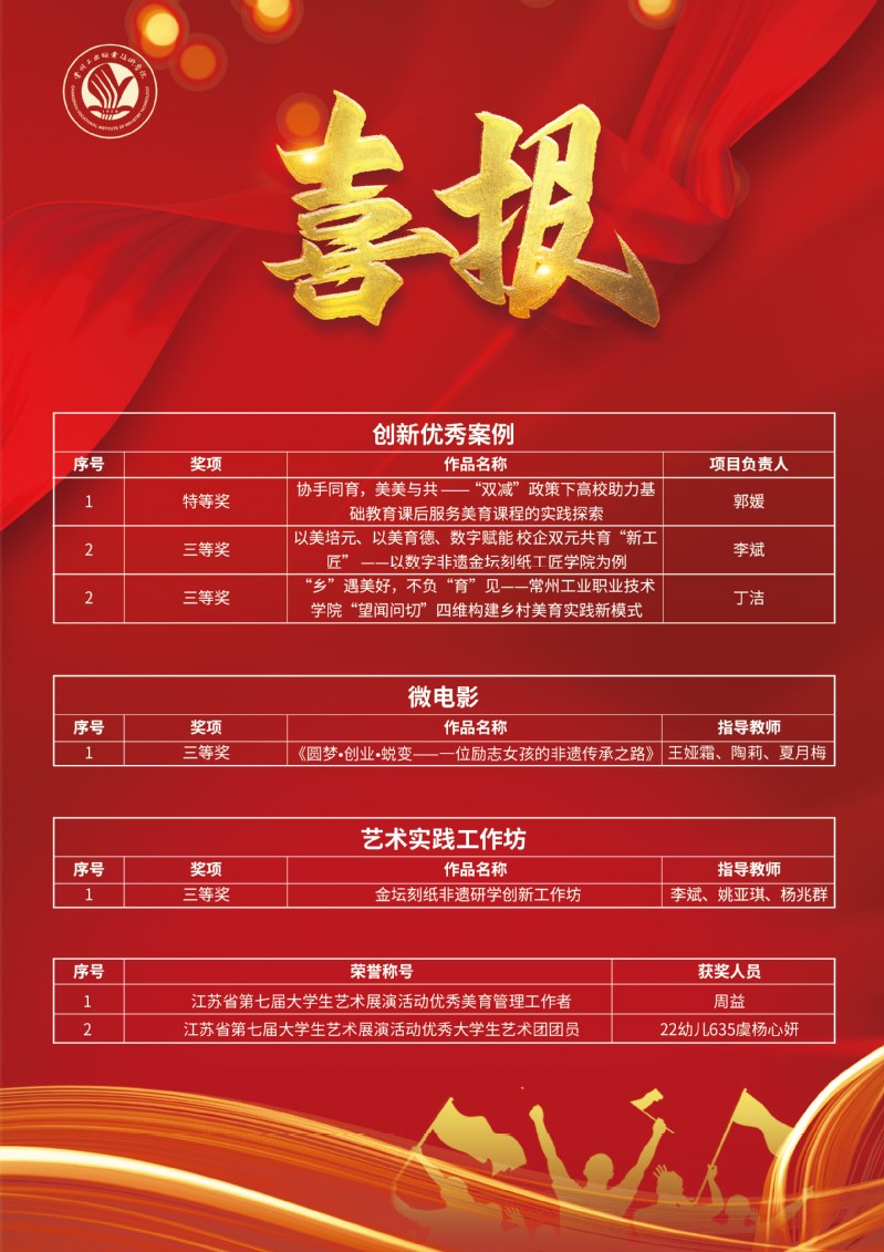 近日,江蘇省教育廳公(gōng)布了江蘇省第(dì)七屆大學生藝術展演活動獲獎情況,常州工業職業技(jì)術學院獲特等獎2項、一等(děng)獎2項、二等獎1項(xiàng)、三等獎12項,同時學校獲評優秀組織獎,周益老師獲評優秀美(měi)育管理工作者、旅遊與康養學院2022幼兒635班虞(yú)楊心妍同學獲評優秀大(dà)學生藝術團團員(yuán)。