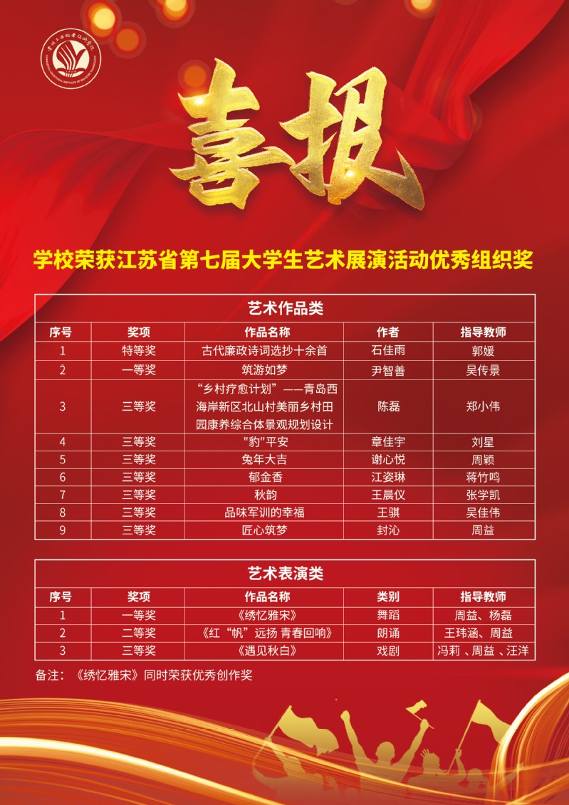 江蘇省大學生藝術展演活動由江蘇省教育(yù)廳主辦,每三年舉行一次,是江蘇省規格最高、規模最大、參與麵最廣、影響力最大的大學生藝術盛會。本屆大學生藝術展演活動以“厚植家國情懷,涵養進取品格”為主題,展演活動的項目分為藝術表演(yǎn)類、大學生藝術實踐工作坊、藝術作品類、高(gāo)校美育改革(gé)創新(xīn)優秀案例四大類,涵蓋舞蹈(dǎo)、聲樂、朗誦、繪畫、攝影、設計、微電影、書(shū)法等多個比賽項目。