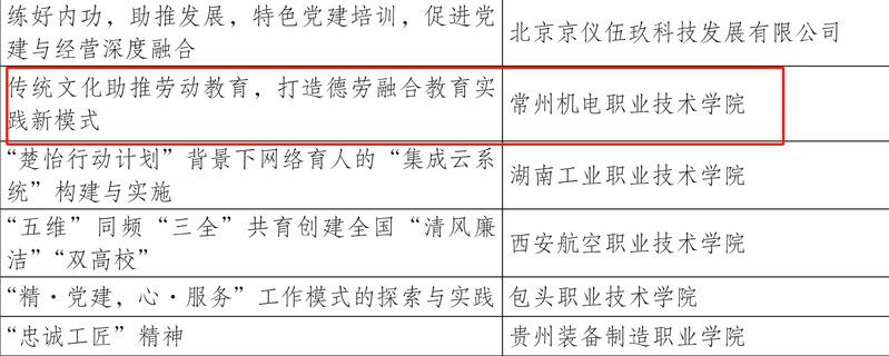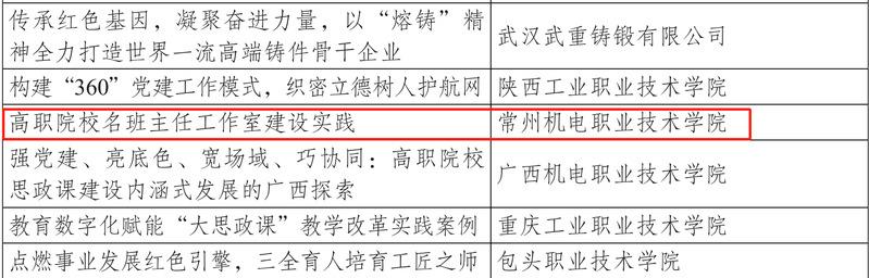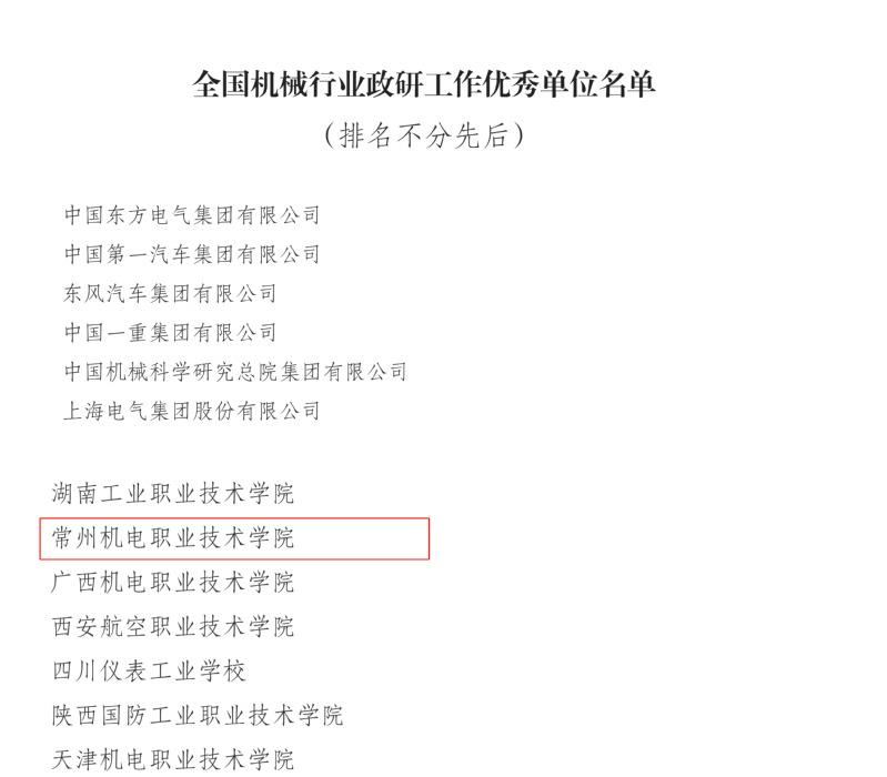 近(jìn)日,中國機械工業職工思想政治(zhì)工作研究會發布了2018—2023年度全國機械行業政治思想文(wén)化建設貢獻榜、先鋒榜和成果(guǒ)榜總榜單的決定。常州機電職業(yè)技術(shù)學院(yuàn)榮獲全國機(jī)械行業政研工作優秀單(dān)位;學校教師李兵榮(róng)獲優秀個人;“高職(zhí)院校名班主(zhǔ)任工作室建設實踐”“傳統文化助推勞動教育,打造(zào)德勞融合教育實踐新模式”等2個案例分別入(rù)選全國機械行業政治思想文化建設創新(xīn)成果二類成果獎和三類成果獎。