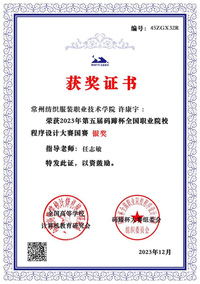 近日,2023年第五屆碼蹄杯程序設計大賽全國總決賽落下帷(wéi)幕。經過省賽選拔,常州紡織服裝職業技術學院的機電學院共有3名選手成功晉級決賽,並在總決賽中斬獲1項銀獎、2項銅(tóng)獎,許康宇獲得銀獎,江佳辰,薑承孝(xiào)獲得銅獎。