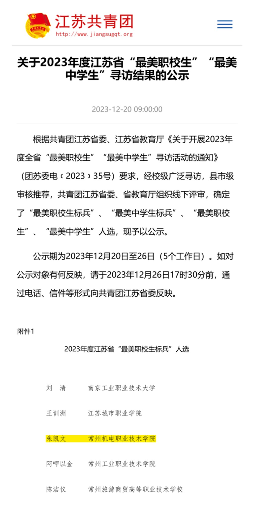 常州機電職業技術學院學生喜(xǐ)獲2023年江蘇省“最(zuì)美職校生(shēng)標兵”榮譽稱號