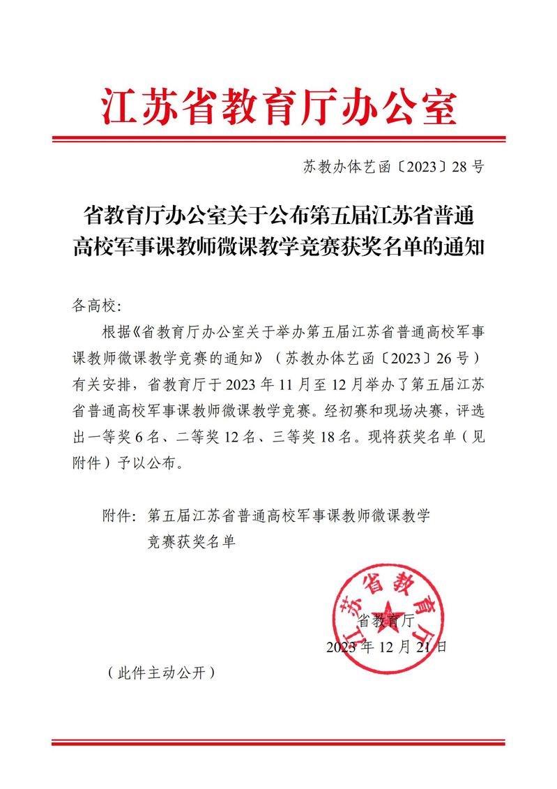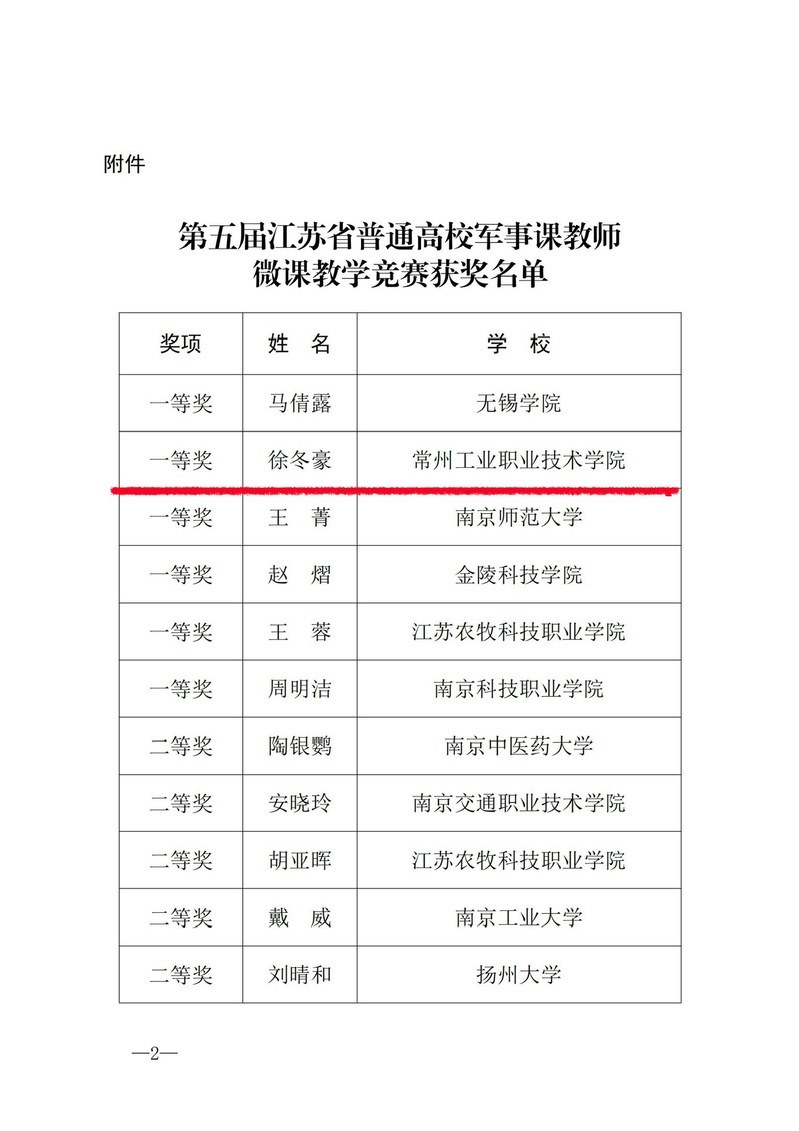 近日,省教育(yù)廳公(gōng)布第五屆江蘇省(shěng)普通高校軍事課教師微(wēi)課教學競賽獲獎情況,常州工業職業技術學院(yuàn)人民武裝部軍事課教師(shī)、機械與交通學院輔導員徐冬豪榮獲一等獎。