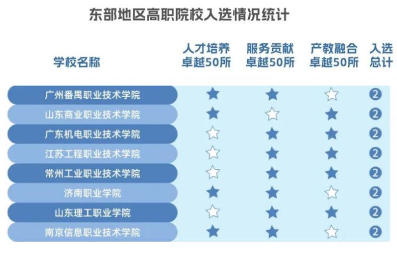 本年度報告在(zài)過往的指數研製與評選(xuǎn)基礎上進行優化,分為東部地區、中部和東北地區、西部地區,各評選出50所人才培養卓越高職院校、50所服務貢獻卓越高職院校、50所產教融合卓越高職院校。東(dōng)部(bù)地區共有17所高職院校入選三大卓越榜單,19所高職院校入選其中兩個卓越榜(bǎng)單。