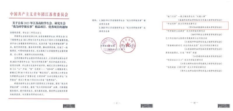 為深入學習貫徹習近平總(zǒng)書記關於青年工(gōng)作的(de)重(chóng)要思想(xiǎng),推動學生會回歸全心全意服務同學的宗旨,鞏固學聯學生會改革成果,近期,江(jiāng)蘇省學生聯合會開展(zhǎn)“我為同學做實事”項目(mù)展示評選活動,常(cháng)州紡織服裝職業技術學院(yuàn)校學生會《“早安同學”我為同學(xué)做(zuò)實事項目》入選2023年江蘇(sū)省(shěng)高校學(xué)生會(huì)“我為同學(xué)做實事”優秀項目。
