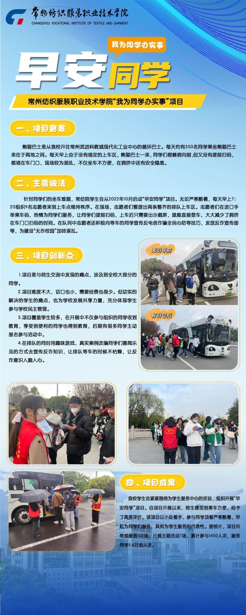 針對同(tóng)學們乘坐“熊貓巴士”往返科教城東區遇到的困難,校學生會從2022年10月啟動“早安同學(xué)”項目,每個工(gōng)作日的早上7點20分組織誌願者(zhě)到上車點維持秩(zhì)序。誌願者們在進口處手舉乘車碼,讓同學們(men)提前掃碼,上車後隻需要出示截屏,就能直接登車,大大減少了擁擠在車門口(kǒu)掃碼的(de)時間。在隊(duì)列中誌願者還積極向(xiàng)等車的同學宣傳預防電信詐騙知識,發放反詐宣傳冊等。