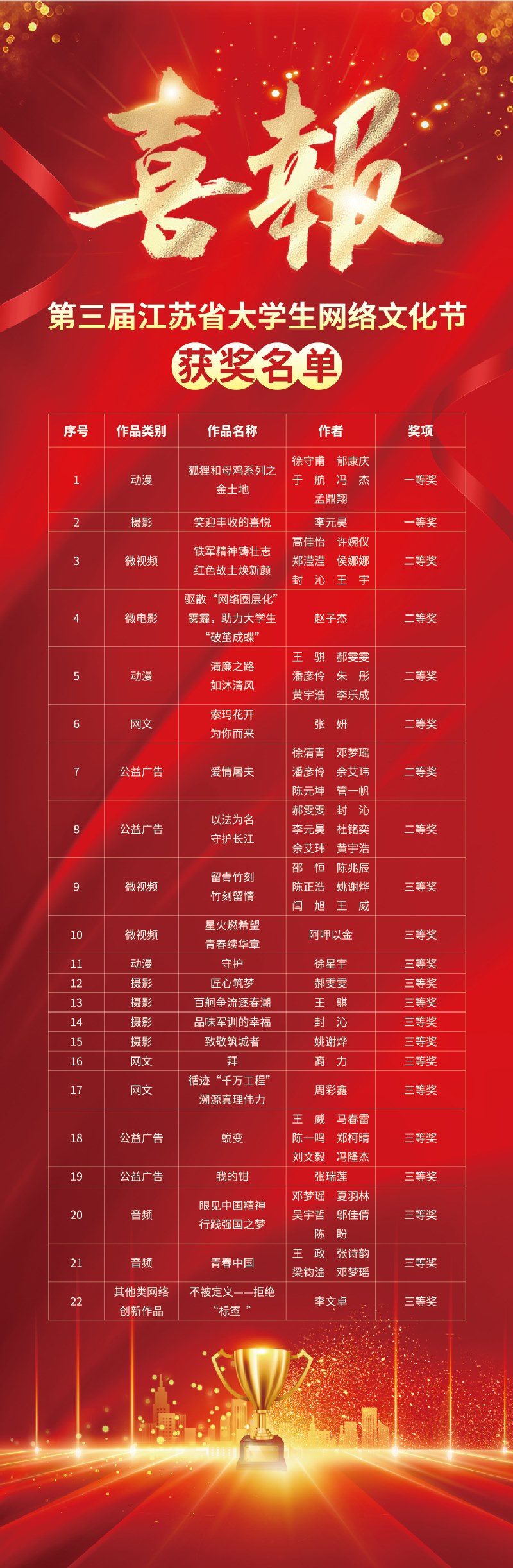 本屆江蘇省(shěng)大學生網絡文(wén)化節和高校網絡教育優秀(xiù)作品推選展示活動於(yú)2023年10月中旬啟動,以“爭做校園好網民,匯(huì)聚網絡正能(néng)量,挺膺擔(dān)當建(jiàn)新功”為主題,麵(miàn)向全省高(gāo)校師生征集作(zuò)品。“大學生網絡文化(huà)節”征集微視頻、微電影(yǐng)、動漫、攝影(yǐng)、網文、公益廣告、音頻、校(xiào)園歌曲、其他類網絡創新作品9類作品,“高校網絡教育優秀作品推選展示活動”征集優秀(xiù)網絡文章、優秀工作案例、優秀(xiù)微課、優秀新媒體作品4類作品。學校積極響應,精心(xīn)組織,廣泛動員全校師生參與。經過(guò)校內遴(lín)選,共推薦60件師生作品參與省賽。