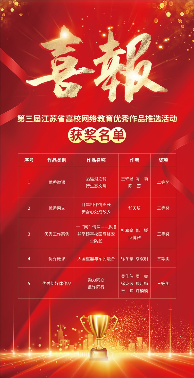常州工業職業(yè)技術學院27件作(zuò)品在第三屆江蘇省(shěng)大(dà)學生網(wǎng)絡文化節和(hé)高(gāo)校(xiào)網絡教育優秀作品推選活動中(zhōng)獲獎