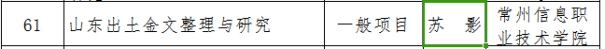 近日,江蘇省哲學社會科學規劃(huá)辦公室公布了2023年度江蘇省社科基金後期資助項目名單,常州信息職業技術學院蘇影博士申報的《山(shān)東出土金文整理與研究》獲批(pī)立項。
