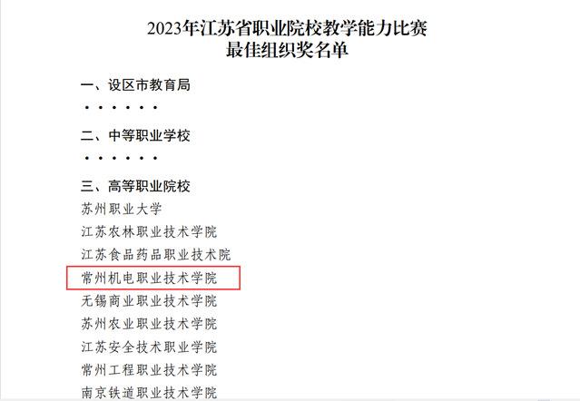 近日,根據《省教育廳等四(sì)部門關於公布2023年江蘇省職業院校教學能力比(bǐ)賽獲獎名單的通知》(蘇教職(zhí)函〔2023〕54 號),常州機電職業技(jì)術學院獲2023年江(jiāng)蘇(sū)省職業院校教學能力比賽最(zuì)佳(jiā)組織獎,這是學校第四次榮獲該項榮譽。