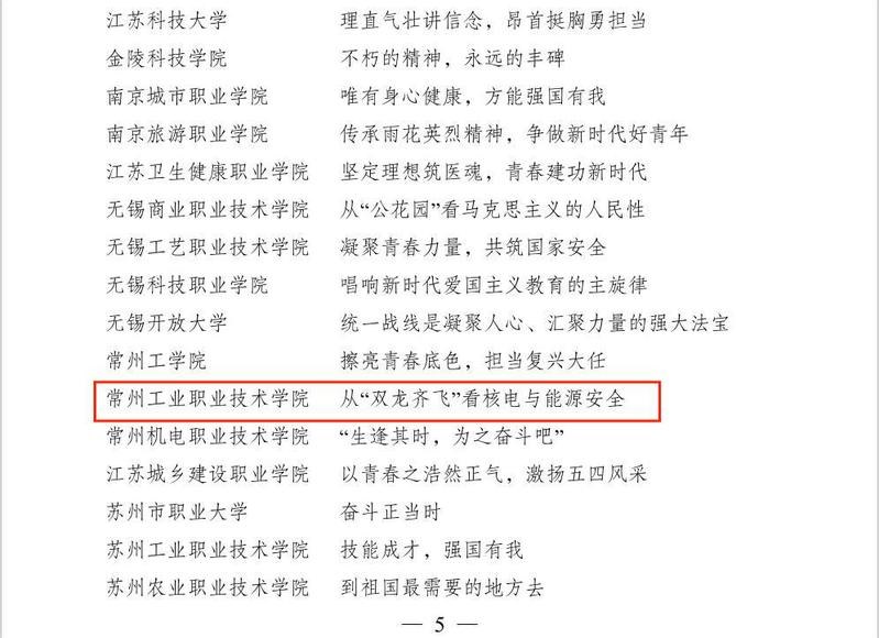 近日,共青(qīng)團江蘇省委公布了2023年全省高校“信仰公開課”省級精品課評選結果,共評出105節“信仰公(gōng)開課”省級精品課,常州工業職業(yè)技(jì)術學院機械與交(jiāo)通學院徐(xú)冬豪老師主講的《從“雙龍齊飛”看核電(diàn)與能源安全》成功入選。