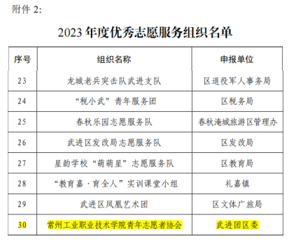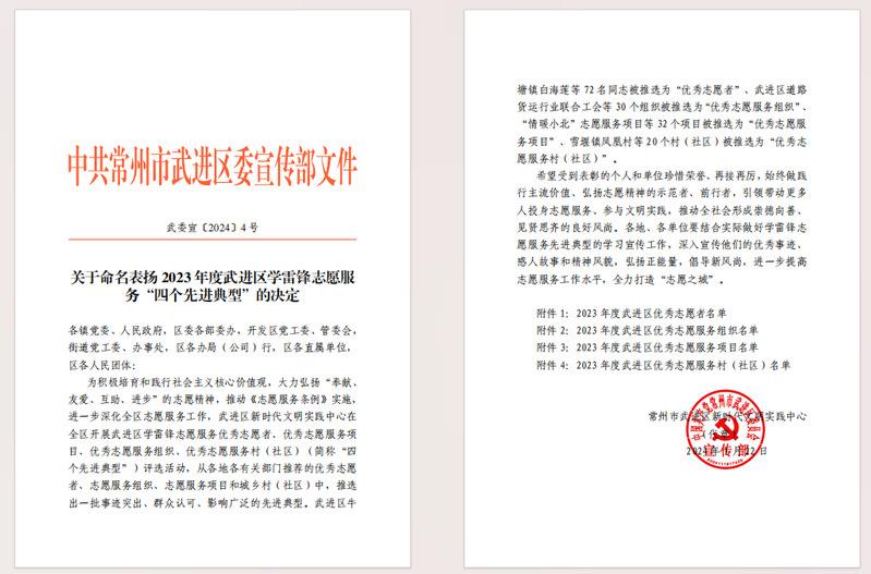 此外,在武進區委宣傳部、區新(xīn)時(shí)代文明實踐中心發布的武進區學雷鋒誌(zhì)願服務“四個先進典型”評(píng)選中,學校青年誌願者協會獲(huò)評年度優秀誌(zhì)願服務組(zǔ)織(zhī)。
