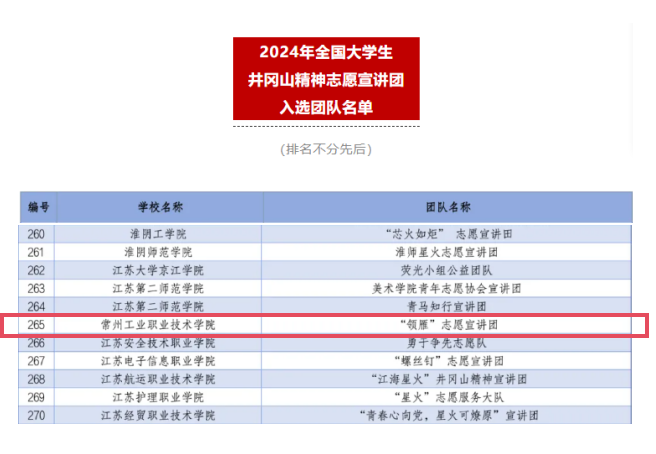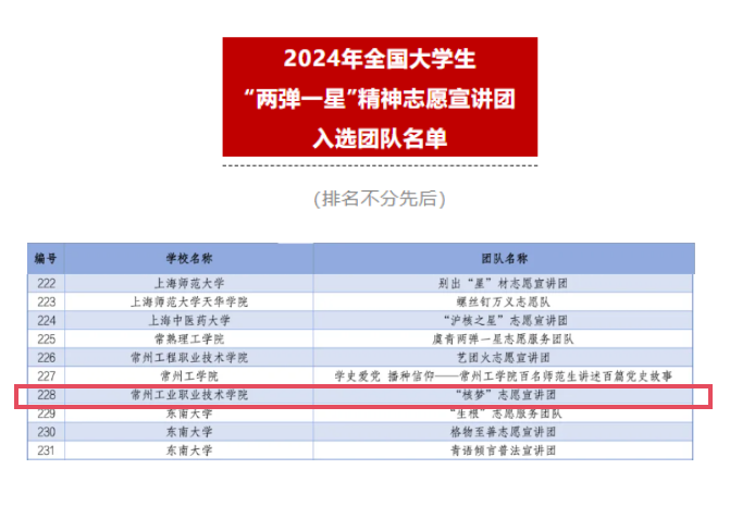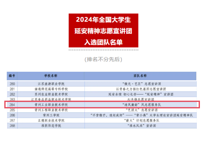 近日,團中央青年誌(zhì)願者行動指導中心麵向全國高校組(zǔ)織(zhī)開展了2024年全國大學生井岡山精神(shén)、延安精神、“兩彈一(yī)星”精神誌願宣講團的遴選工作。常州工業職業技術學院數(shù)字商務學院“清風廉韻”風誌願服務隊、旅遊與康養學院“領雁”誌願宣講團(tuán)、“核夢”誌願宣講團從全國數千支宣講隊伍中脫穎(yǐng)而(ér)出,順利(lì)入選三類專項(xiàng)宣講活動。