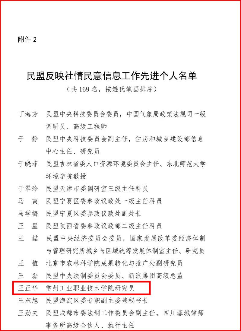 4月9日,民盟中央2024年參政議(yì)政工作會議在北京召開。會議表彰了2023年度參政議(yì)政工作(zuò)及反(fǎn)映社情民意信息工作先進(jìn)集體和先進個人。常州工業職業技術學院民盟支部盟員(yuán)王正華獲“民盟反映社情(qíng)民意信(xìn)息工作先進個人”稱號,這是王正華第二(èr)次獲此殊榮。