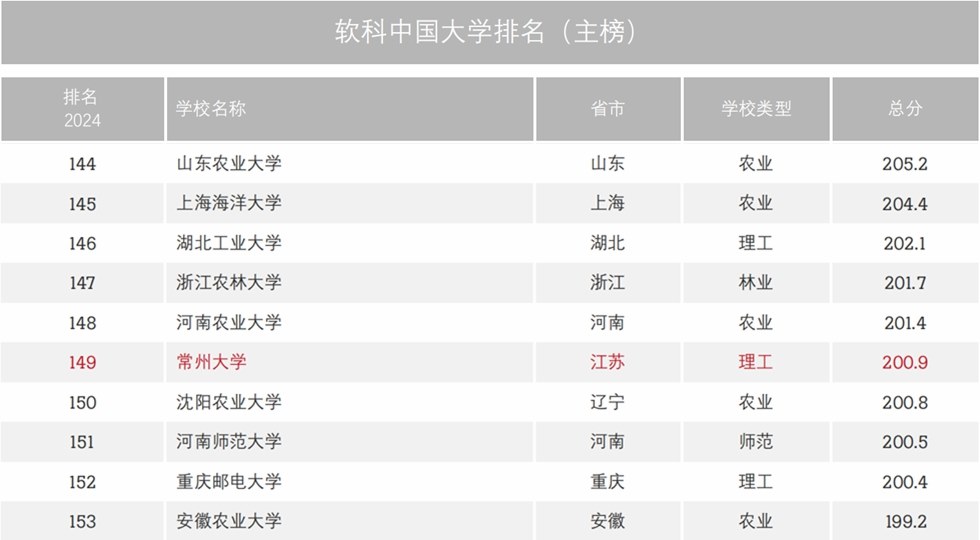 2024年軟科中國大(dà)學排名(主榜)上榜高校共594所,常州大學綜合排名為近三年最(zuì)佳,位列全國第149名,較上一年度提升3名;全國理工(gōng)類高校第60名,較上一年度(dù)提(tí)升1名;江蘇省內高校第19名。在辦學資源、科學研究、服務社會、高端人才以及國(guó)際競爭力等5個單項模塊中,常州大學表現較為突出,各單模塊排名均高於綜合排名名次。