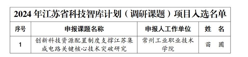 近日,省科協公(gōng)示了2024年江蘇省(shěng)科技智(zhì)庫計劃(調研課題)項(xiàng)目入選名(míng)單,此次共遴選出90項科技創新類調研課題和10項省科協十大代表(biǎo)類調研課題,全省高職院(yuàn)校僅入選3項。其中,常州工業職業技術學院旅遊與康養學院(yuàn)苗圃老師的課題“創新科技資源配置製度支(zhī)撐江蘇集成電路(lù)關鍵核心技術突破研究”成功入選。這是學校首次入(rù)選該類項目。