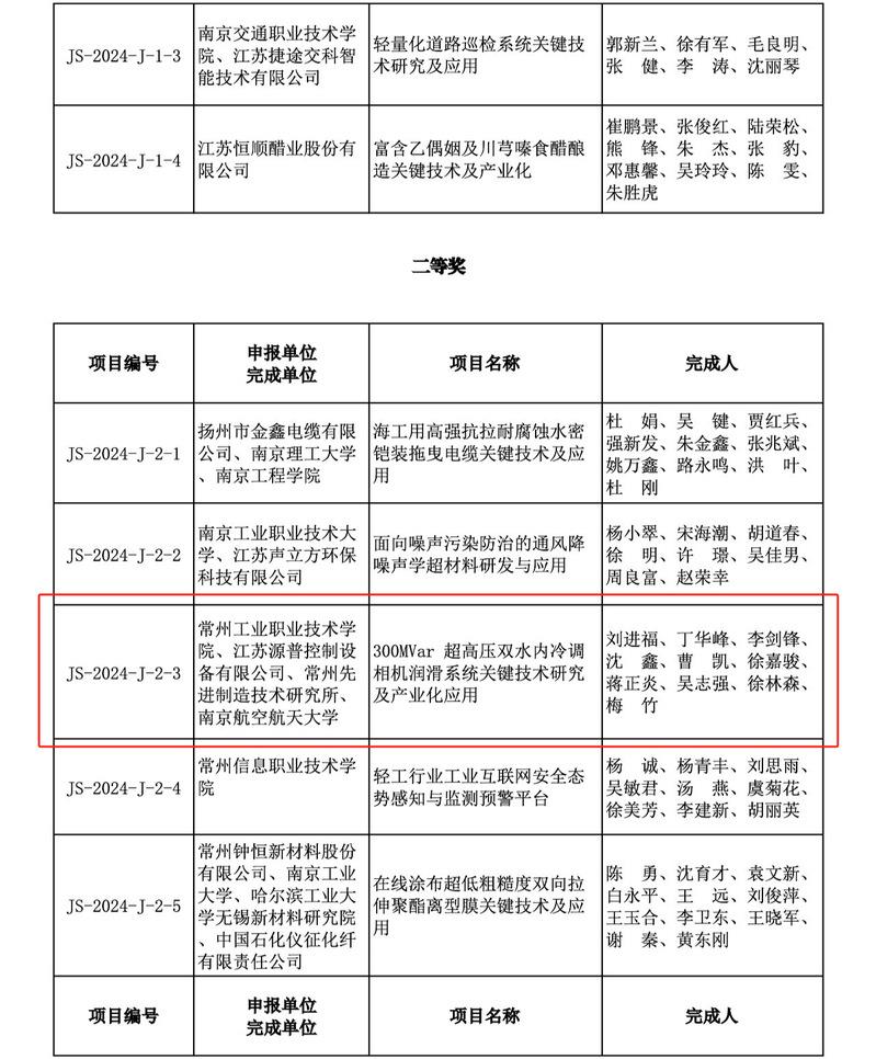由常(cháng)州工業職(zhí)業技術(shù)學院和江蘇源普控製設備有(yǒu)限公司、常州先進製造(zào)技術研究所、南京航空航天大學聯合申報完(wán)成,我校(xiào)劉進福、丁華(huá)峰、李劍鋒、蔣正炎等人主要(yào)完成的《300MVar超高壓雙水內冷調相機潤滑係統(tǒng)關鍵技術研(yán)究及(jí)產(chǎn)業化應用》獲技術進步獎二等獎;由(yóu)我校和中科(kē)摩通(常州)智能製造(zào)股份有限公司、常州先進製造技術(shù)研(yán)究(jiū)所聯(lián)合申報完成(chéng),學校王可、劉進福、李劍鋒、於鬆、施琴、沈(shěn)建明等人主要完成的(de)《JC-WL221008新能源汽車熱(rè)管理係統智能成套裝備技術及(jí)產業化》獲技(jì)術(shù)進步獎三(sān)等獎。