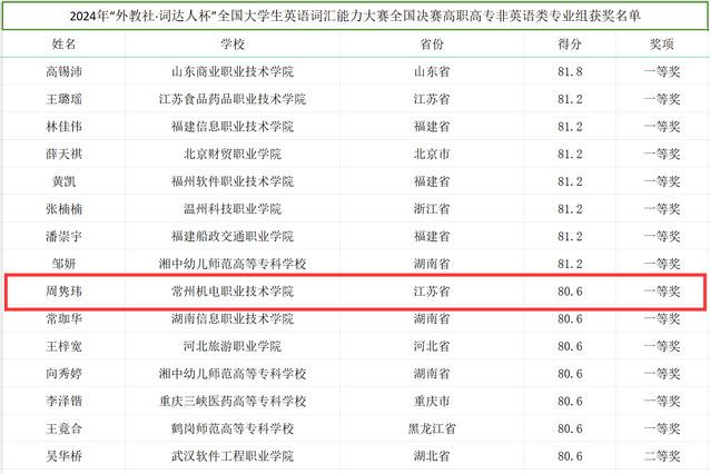 6月4日,2024年(nián)“外教社(shè)·詞達人杯”全國大學生英語詞匯能力大賽全國決賽成績公布,常州機電(diàn)職業(yè)技術學院信息工程學院學生周(zhōu)雋瑋(指導教師:鄭雲娟)以高(gāo)職高專非英語(yǔ)專業組第45名的好成(chéng)績獲全國一等獎,實現了曆史(shǐ)性突(tū)破。