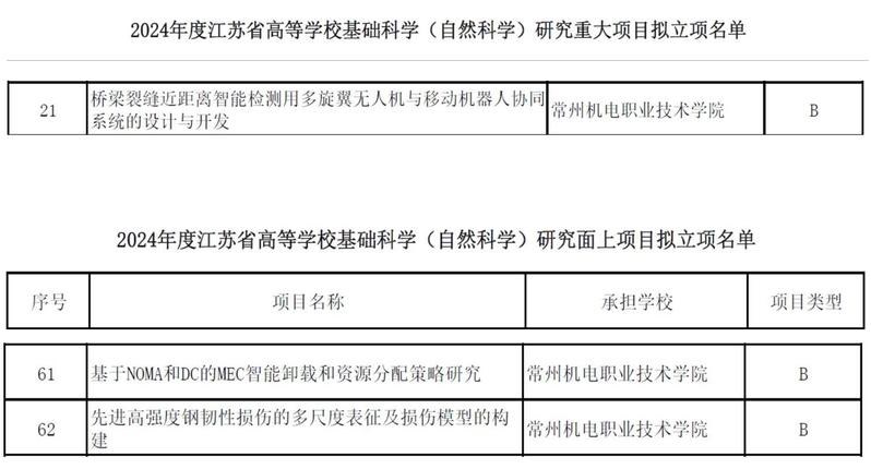 近日,江蘇省教育廳公布2024年度高校自然科(kē)學(xué)基金(jīn)項目(mù)立項(xiàng)名單,常州機電職業技術(shù)學(xué)院電氣工程學院束攀峰博士主持的《橋梁裂(liè)縫近距離智能檢測用多(duō)旋翼無人機與移動機器人協同(tóng)係統的設計與開發》獲批重(chóng)大項目立項;信息工程學院李長祥博士主持的《基於NOMA和DC的MEC智能卸載和資(zī)源分配策略研究》,模具技術學院陳嘉棟博士(shì)主持的《先進高強(qiáng)度(dù)鋼韌性損傷的多尺度表征及(jí)損傷模型的構建》均獲得麵上項目立項,立項總數位於常州市高職院校首位。