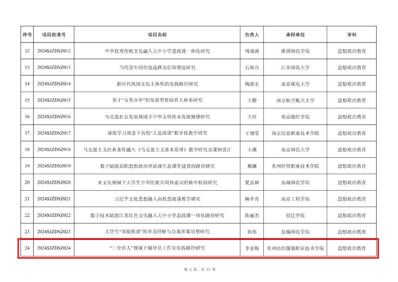 近日,江蘇(sū)省教育廳公布了2024年度高校哲學社會科(kē)學(xué)研究重大項目立項名單,常州紡(fǎng)織服裝職業技術學院李喜梅老師主持的《“三全育人”視域下輔導員工作室實踐路徑研究》獲批思想政治教育學科立項,這是學校自2019年以來第4次獲(huò)批省(shěng)高校哲社重大項目立項。今年全省高校共獲批立項重大項目180項,其中(zhōng)職業院校共立項14項。