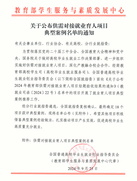 近日,教育部公(gōng)布2024年供需(xū)對接就業育人項目典型案例名單,常(cháng)州工程職業技術學院與華住酒店集團合(hé)作的“華(huá)住店長班”酒店人才提升計劃項目在(zài)2萬(wàn)餘個申報項目中脫穎而出,成為全國18個(高職(zhí)院校2個)典型案例之一,這也是學校首次獲得該獎項。這一榮譽的獲得,標誌(zhì)著學(xué)校在深化產教融合、校企合作方麵取得了顯(xiǎn)著成效,為促進學生充分高質量就業提供了(le)有力(lì)保障,為職業教育高質量發展樹立了新的標杆。