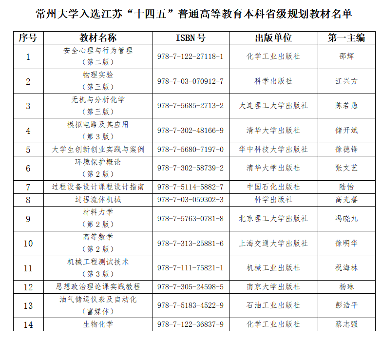 近日,江蘇省教育廳公(gōng)布了江蘇“十四(sì)五”普通高等教育本科省級規劃教材名單,常州(zhōu)大學《思想政治理論課實踐教程》等14部教材入選省級規劃教材,其中(zhōng)6部教材入(rù)選“十四五”普通高等教育本科國家級規劃教(jiāo)材推薦名單(dān)。