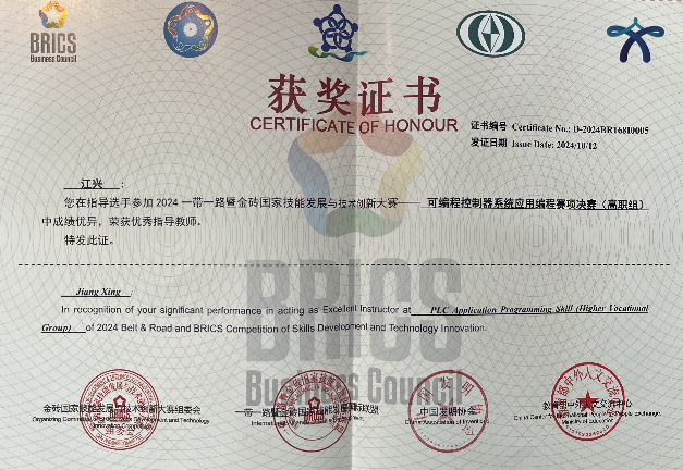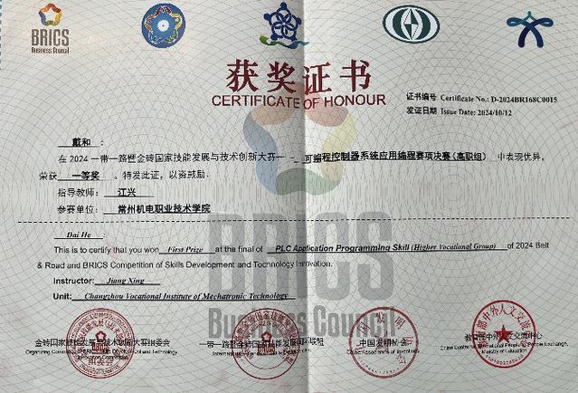 10月10日-12日,2024“一帶一路(lù)”暨金磚國家技(jì)能發展與技術創新大賽(sài)“可編程(chéng)控製器係統應(yīng)用(yòng)編(biān)程”賽項在石河子舉行,來(lái)自全國19個省市的101支參賽隊參加比賽。常州機(jī)電職業技術學院電氣工程學院自動化2236班學生戴和獲(huò)高職組賽項一等獎,指導教師江(jiāng)興獲“優秀指導教師”稱號。