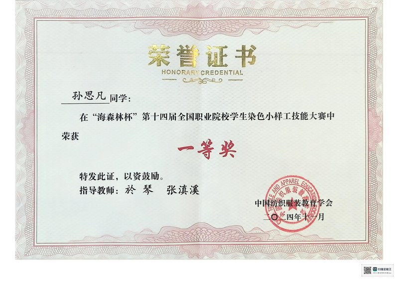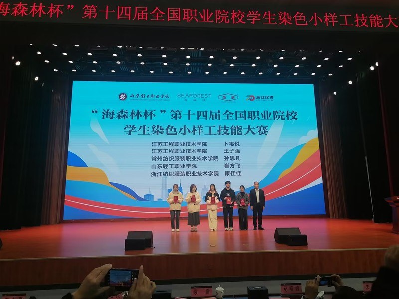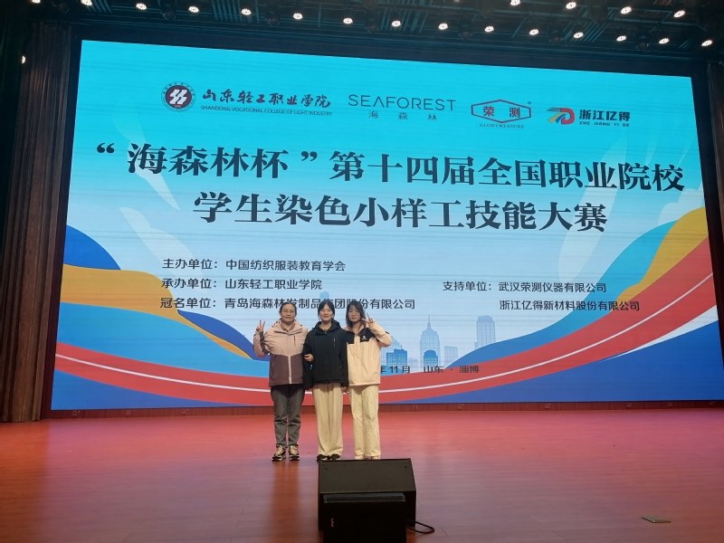 2024年11月15日至17日,“海森林杯”第十四屆全國職業院校學生染色小樣工(gōng)技能大賽在山東輕工職業學院(yuàn)落下(xià)帷幕(mù),常州紡織服裝職業技術學院的(de)智能紡織與材料學(xué)院於琴、冒亞紅、張滇溪團隊指導的學生團隊喜獲一等獎和優秀獎。