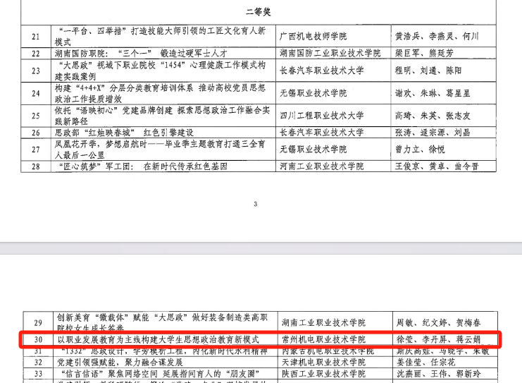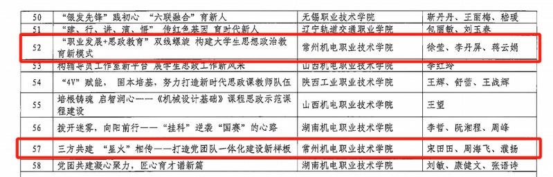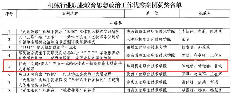近日,經組織推薦、資格審核、專家(jiā)遴選等程(chéng)序,中國機械工業職工思想政治工作研究會對2024年度全國機械行業思(sī)想(xiǎng)政治工作優(yōu)秀案例(lì)遴選結果予以發布,常州機電職業技術學院共有5個項(xiàng)目獲獎,其中一等獎1項、二等獎3項、三等獎(jiǎng)1項。