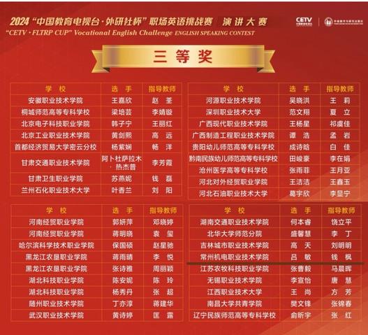 常州機電職業技術學院學生在2024“中國教育電視台·外研社杯”全國演講賽中獲三(sān)等獎