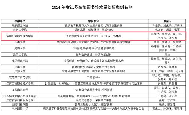 12月25日,江蘇省高等學校圖書情報工作(zuò)委員會(huì)公布2024年度江(jiāng)蘇高校圖書館發展創(chuàng)新案例名單,常州機電職業技術學院圖書館報送的《文化傳承視角下行遠書苑(yuàn)“11333”育人工作體係》案例入選。