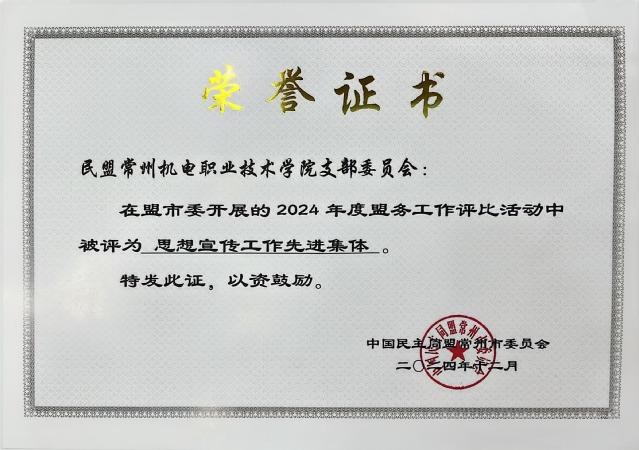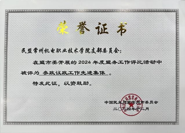 12月23日,民盟常州市十四屆四次全委會議在市行政中心舉行(háng),會上表彰了2024年度先進集體和先進個人(rén)。常州機(jī)電職業技術學院民盟支部獲評思想宣傳工作(zuò)先進集體、參政議政工作先進集體,蔣慧敏(mǐn)獲(huò)評思想宣傳工作先進個人、參(cān)政議政工作先進個人,莊薇(wēi)薇獲評社會服務工(gōng)作先進(jìn)個人。2022-2024年我(wǒ)校民盟支部已連(lián)續(xù)三年(nián)蟬聯多項先進集體榮譽。