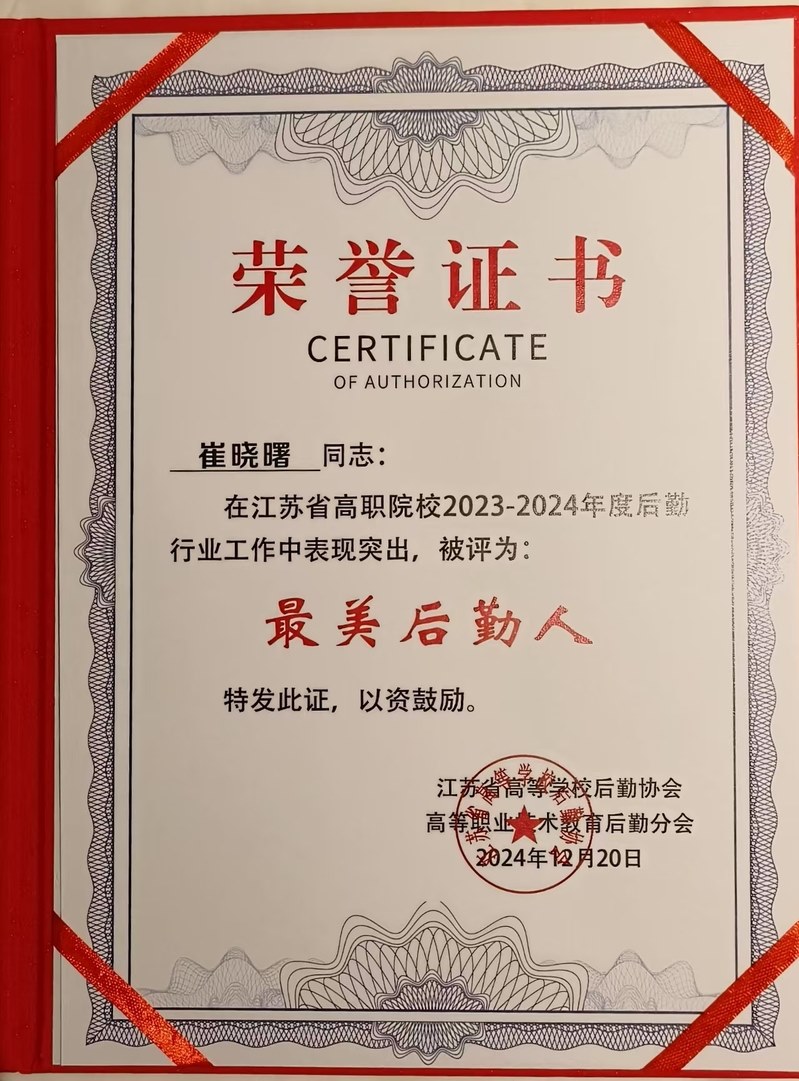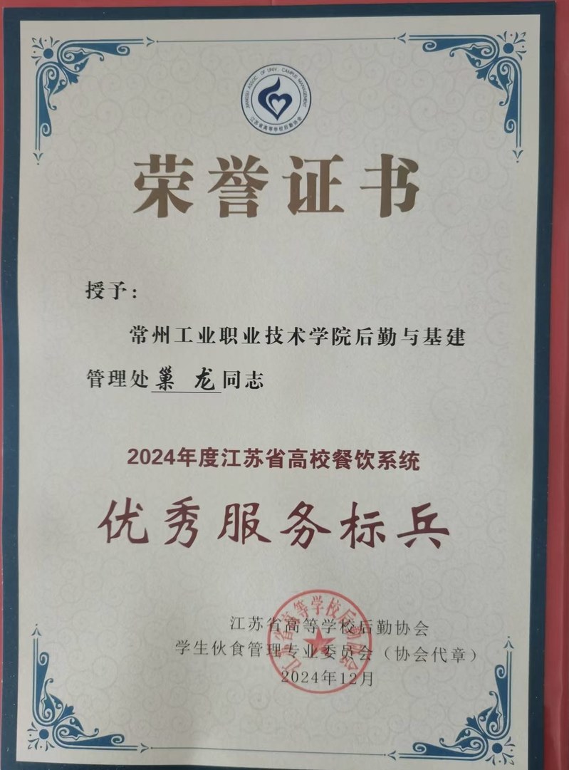 12月24-26日,江蘇省高等學校後勤協會高等職業技術教(jiāo)育後勤分會(huì)在揚州順利召(zhào)開第二屆第三次會(huì)員大會(huì)。會上,常州工業職業(yè)技術學院憑(píng)借卓越的後勤管理與服(fú)務,榮獲“江蘇省高職院校2023-2024年(nián)度後勤(qín)行業(yè)先進(jìn)單位”稱號,全省僅有(yǒu)26所高職院校獲此殊榮。後勤與基(jī)建管理處處長崔(cuī)曉曙被授予“江蘇省高職院校2023-2024年度最美後(hòu)勤人”稱號,巢(cháo)龍榮獲(huò)“2024年度江蘇省高校(xiào)餐飲係統優秀服務標兵(bīng)”稱號。