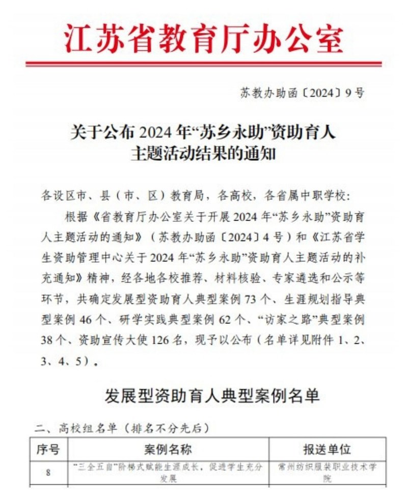 近日,江蘇省教(jiāo)育廳公布了2024年“蘇鄉永助”資助育人主題活動的結果,常州紡織服裝職業技術(shù)學院(yuàn)數字商貿學院的輔導員馮益芙老師(shī)撰寫的《“三全(quán)五自”階梯式賦能生涯(yá)成長,促進學生充分發展》獲評發展型資助育人典型案例。