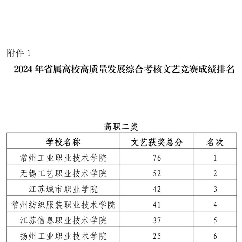 在近日公布的2024年省屬高(gāo)校高質量(liàng)發展綜合考核(hé)文藝競賽成(chéng)績(jì)排名中,常州工業職(zhí)業技(jì)術學院以文藝獲獎總分76分位列省(shěng)屬高校(高職二類)第一(yī)名。學校已連續兩年(nián)蟬聯此類排名第(dì)一。