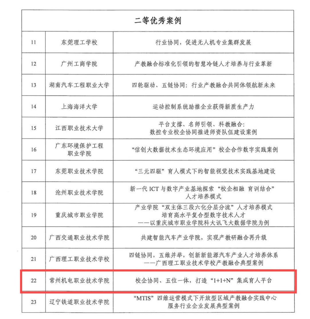近日,由常州機電職業技術學院機械工程學院和產教合作部聯合報(bào)送的(de)《校企協同、五位一體,打造“1+1+N”集成育人平台》案例入選工業和信息化部2024年產教融合優秀案例(lì)。