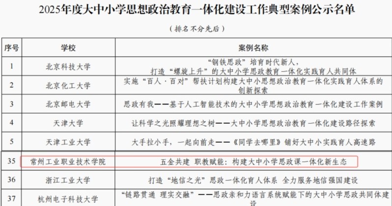 近日,教育部辦公廳公布了2025年(nián)度高校思想政治工作質量(liàng)提升(shēng)綜合改革與精品建設項目入選名單。常州工業職(zhí)業技術學院學生工作處邢凱嶺團隊申報(bào)的《雙區(qū)協同係統集成,織密學生社區治理之網》入選2025年度全國高校(xiào)示範“一站式”學生社區,馬克思(sī)主義學院李飛團隊申報的《五金共建職教賦能(néng):構建大中(zhōng)小(xiǎo)學思政課一體化新生態》入選2025年度大中(zhōng)小學思想政治教育(yù)一體化建設工作典型(xíng)案例,學生工(gōng)作處黃靜團隊申報的《多種技術(shù)共融解(jiě)惑守護危機學生成長》入選2025年度高校學生心理健康教育指導典型案例。這是學校首次獲批全國高校思想政治工作質量提升綜合改革與精品建設(shè)項目,入選項目數量在全國高職院校中位列第一,實現了在這(zhè)一國家級項目上的曆史性突破。