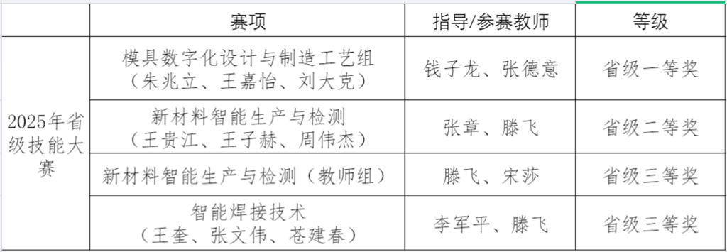 錢子龍、張德意(yì)老師指導的學生團(tuán)隊獲模具數字化設計與製(zhì)造工藝賽項學生組一等獎;張章、滕飛老師指導的學生(shēng)團隊獲新材料智能生產與檢測賽項學生(shēng)組二等獎,滕飛、宋莎老師獲該賽項教師組三等獎;李軍平老師指導的學生團隊獲智能(néng)焊接技術賽項(xiàng)學生(shēng)組三等獎。