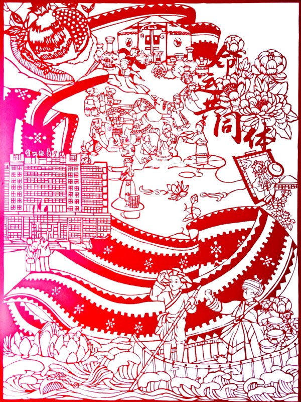 《悠悠運河情共(gòng)築同心夢》則采用國家級非物質文化遺產“金壇刻紙”的藝術形式,緊扣“鑄牢中華(huá)民族共同體意識”主題,巧妙地將(jiāng)常州地域(yù)文化符號與(yǔ)多民族元素相融合,充分展現了中華(huá)文化的豐富多樣性和(hé)民族團結精神。