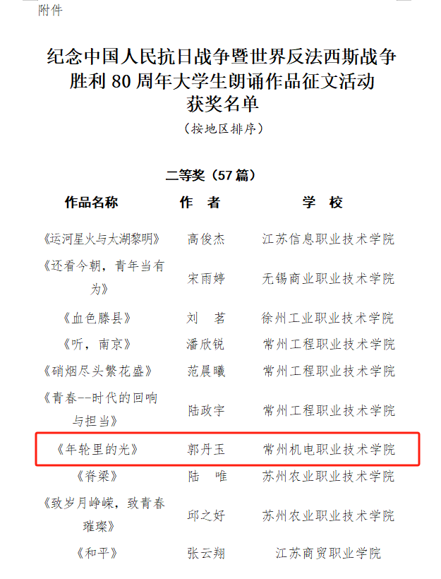近日,由(yóu)江蘇省學校美育協會、江(jiāng)蘇省大學生藝術團聯(lián)合會主辦的“銘記曆史 珍愛和平”紀念中國人民抗日(rì)戰爭暨世界反法西斯戰爭勝利80周年大學生朗誦作品征文活動結果揭曉。常州機電職業技(jì)術學院經濟管理學院學生郭丹玉創作的作(zuò)品《年輪裏(lǐ)的光》榮獲二等獎。