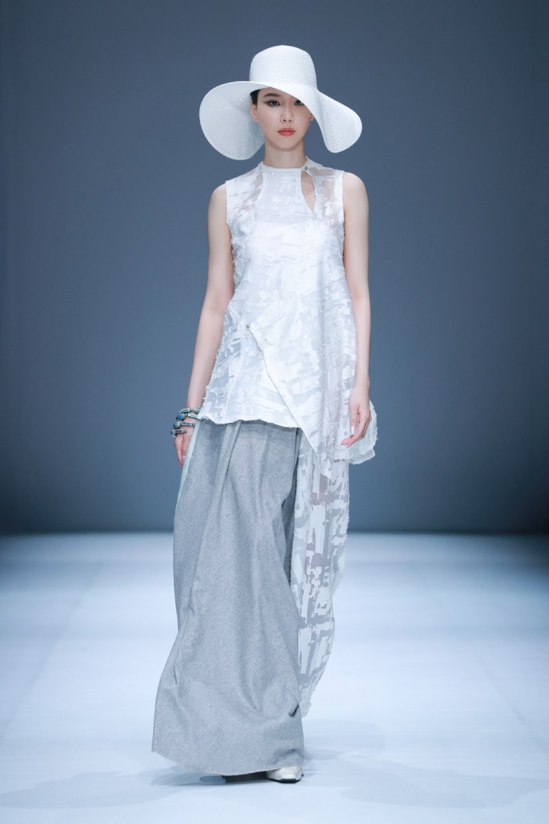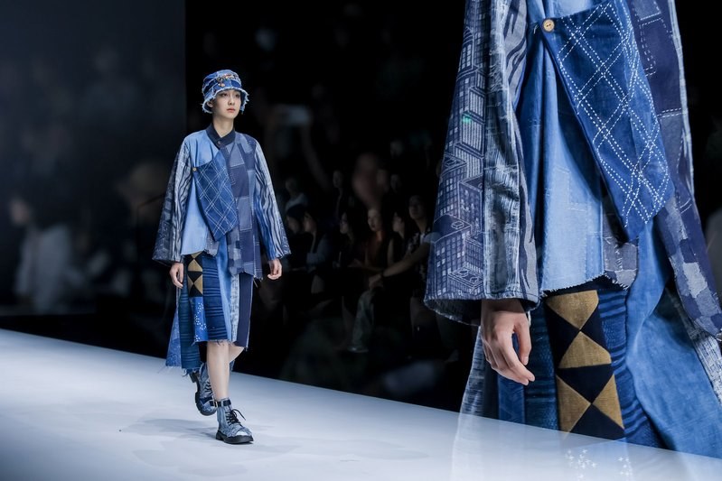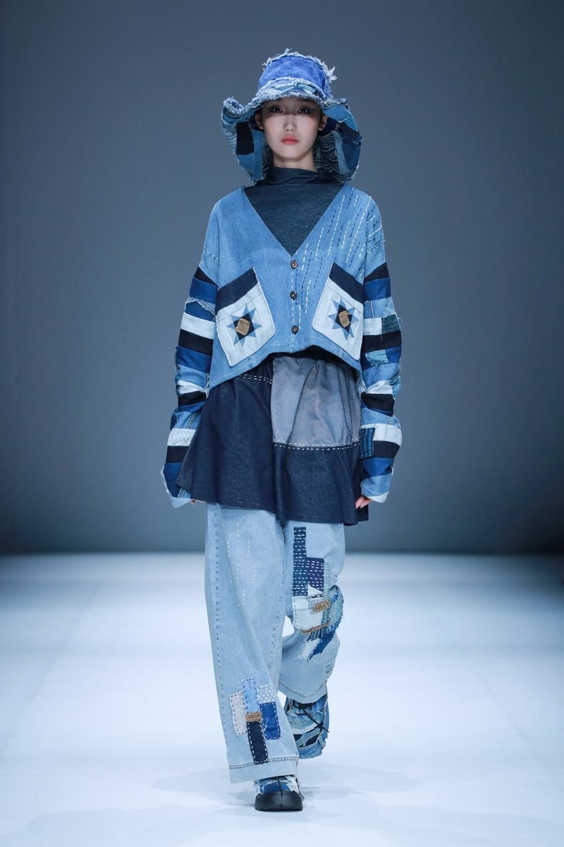 作(zuò)品采用“織界”“華彩”“煥承(chéng)”三個篇章呈現。篇章一(yī)“織界”以“織”呼應紡織工藝,以“界”暗喻不同布料的跨界融合,並運用多種牛仔麵料進行創新拚接與剪裁,在保留牛仔個性的同時(shí)賦予服裝全新(xīn)質感,演繹出別樣質感(gǎn)與風貌,彰顯學子對(duì)服裝材質與工藝的深入探索。